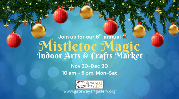 Each year from Thanksgiving to Christmas, the Gateway Art Gallery hosts our annual Mistletoe Magic Arts and Craft Market. This annual shopping extravaganza features art, jewelry, crafts, ornaments, cards, home décor, painted furniture, prints, and much more—all handmade by local artisans and crafters. No mass produced or commercial products to be found anywhere, only real […]