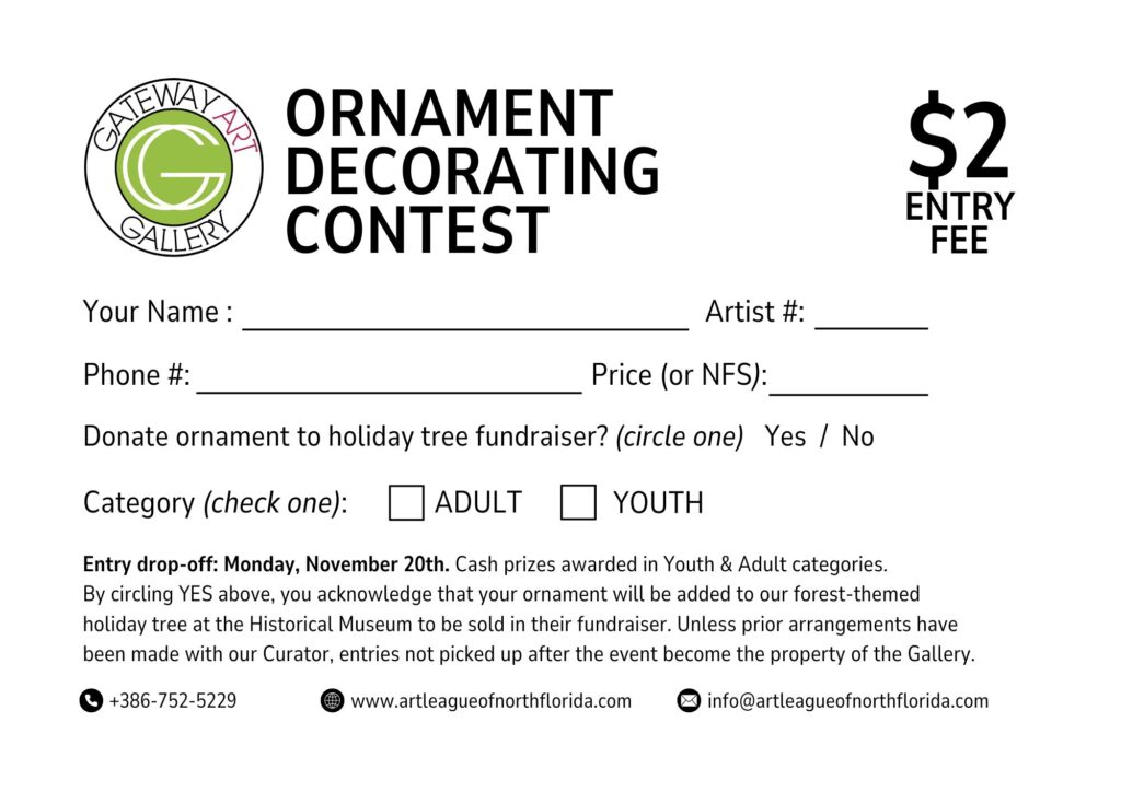 This year, the Gateway Art Gallery is proud to participate in the Lake City/Columbia County Historical Museum’s holiday fundraiser. Our Deer/Forest-themed tree will be decorated in lime green, maroon, and gold/copper. We’re accepting ornament donations from the contest (or others that fit the theme/color scheme) to decorate our tree. If you’d like to help, come to the Museum downtown at 10 am on Friday, Nov. 21st. All trees in the fundraiser will be auctioned off on Saturday, November 22. Proceeds from the sale of our tree benefit the Historical Museum and the Gallery. When our tree finds its new home, the community-made ornaments go with it — carrying your creativity into the season while supporting local history and the arts.