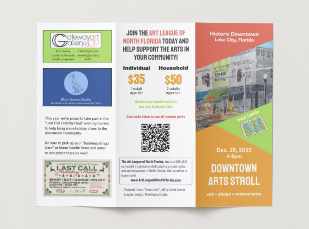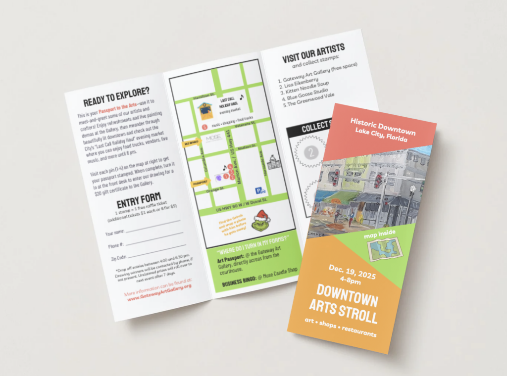 Grab your Passport to the Arts and head out to the pinned locations to explore and get your stamps. (BONUS THIS YEAR: be sure to grab a Business Bingo card and hit all the “Last Call Holiday Haul” locations as well for more fun and prizes! )