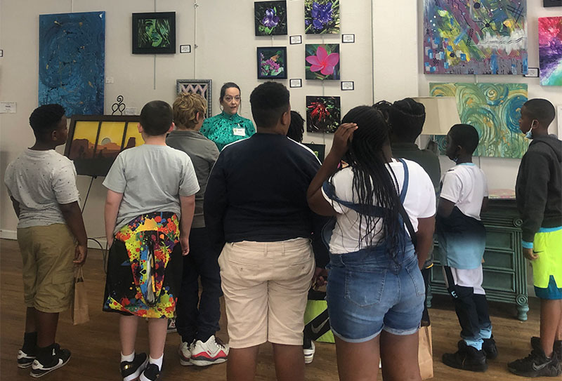 Field Trip Time! Working with Helen Beatty, art educator of the Columbia County Schools, 36 elementary students from Niblack had a field trip to the downtown Art League of North Florida/Gateway Gallery in Lake City. Curator Shelia Carr with area artists Carol Cieslik, Laura Hunter-Null, Cindy Sleezer, Sandy Glover, Fran Thompson, and Susan Larson co-ordinated the event, which included an introduction to the history, genres, and importance of art across the ages. Sandy and Cindy painted faces for all the children.